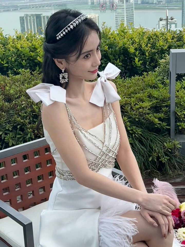 前几天刷到现场图就挪不开眼,8月31日的生日宴上,她穿的Miu Miu白色蕾丝吊带长裙也太绝了。雪纺料子软乎乎的,灯光下泛着淡淡的珠光,走路的时候裙摆飘起来,灵动得像蝴蝶振翅。